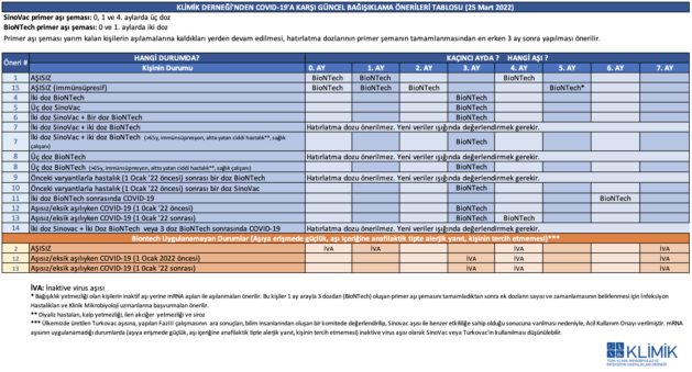 Türk Klinik Mikrobiyoloji ve İnfeksiyon Hastalıkları Derneği (KLİMİK),  aşı şeması tamamlanmadan veya hiç aşılanmadan Omikron ile  hastalık geçirmiş olan kişilerin (Delta varyantına yeterli bağışıklıkları olmayacağı için) hastalıktan 3 ay sonra başlamak üzere 1 ay arayla iki doz BioNTech aşısı olmaları önerildi.